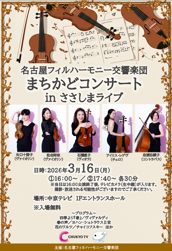 名古屋フィルハーモニー交響楽団による**「まちかどコンサート」**を開催いたします。 ぜひお気軽にお立ち寄りください。
